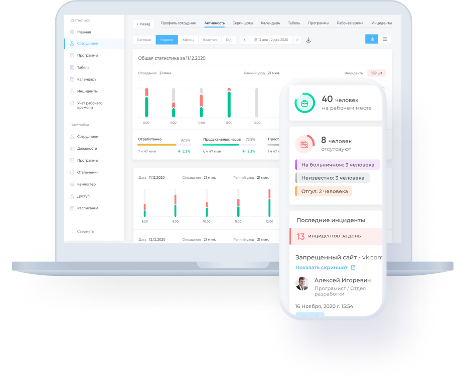 - Панель управления — веб-интерфейс мониторинга и контроля работы сотрудников за ПК и смартфонами.